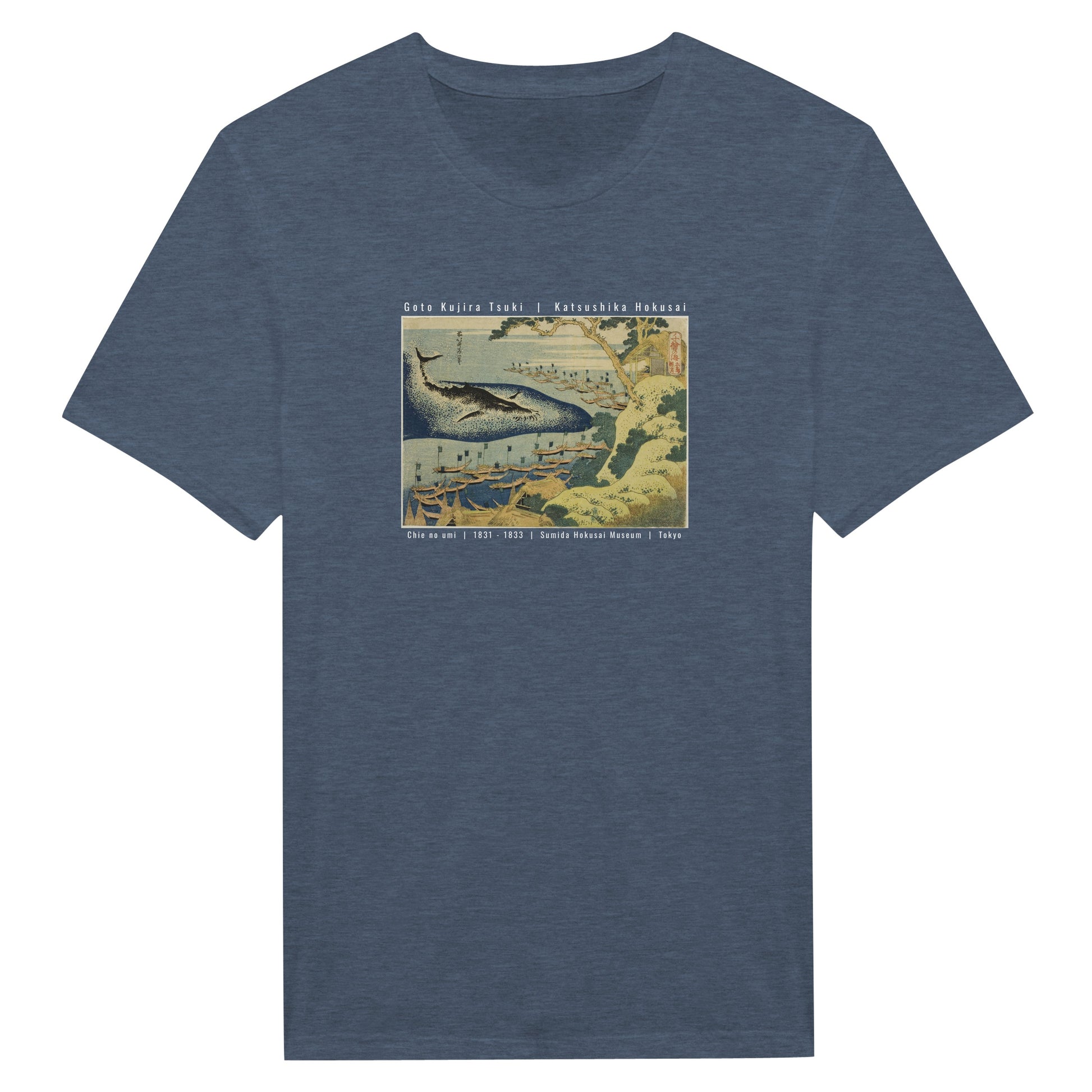 Questa maglietta presenta la celebre opera "Caccia alle balene al largo delle isole Goto" (Goto Kujira Tsuki) del maestro Katsushika Hokusai. Parte della serie "Oceano di saggezza", questa stampa ukiyo-e cattura la forza del mare e la tradizione millenaria del Giappone con uno stile grafico intramontabile.